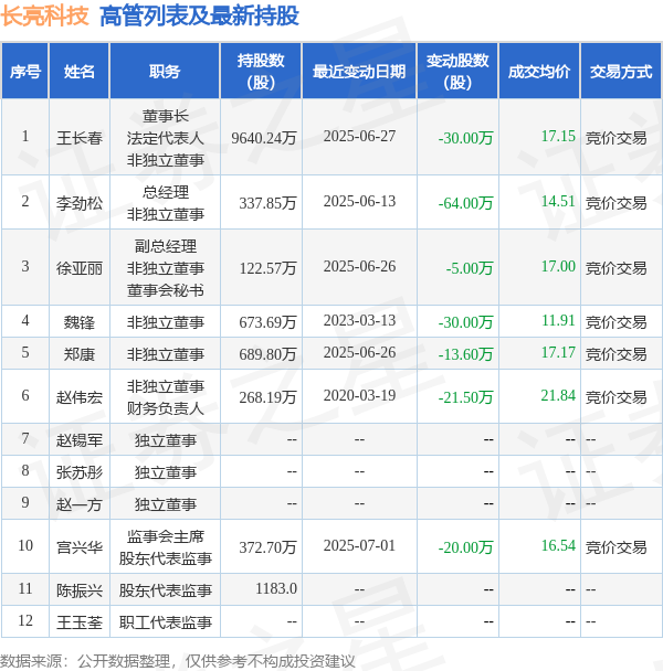 长亮科技的高管列表及最新持股情况如下: