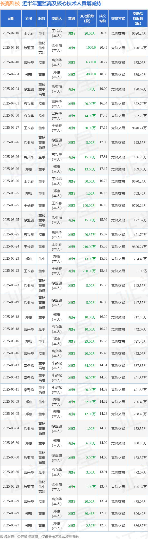 长亮科技近半年内的董监高及核心技术人员增减持详情如下:
